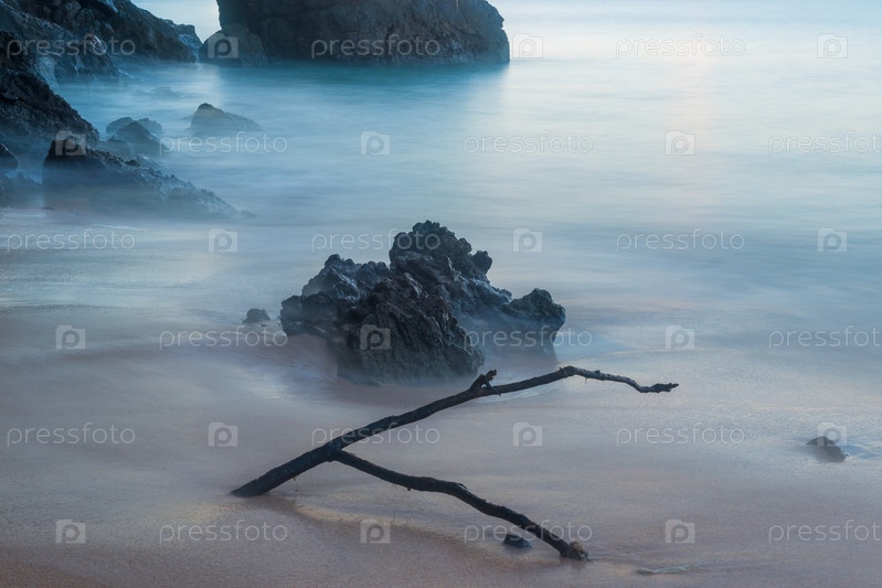 На бревне пляжа и мощеном булыжнике на рассвете темная фотография