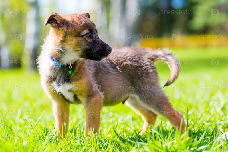 Портрет игривого щенка на фоне зеленой травы в ближайшем парке