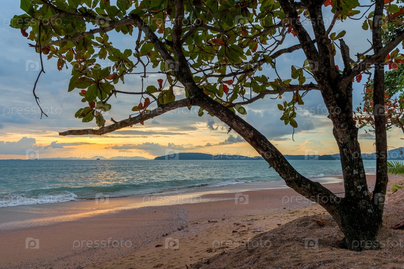 Тропическое дерево на песчаном пляже в Таиланде на фоне заката над морем