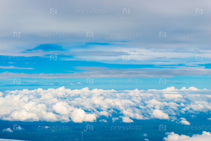 Красивые кумулозные облака и голубое небо с окна самолета на большой высоте