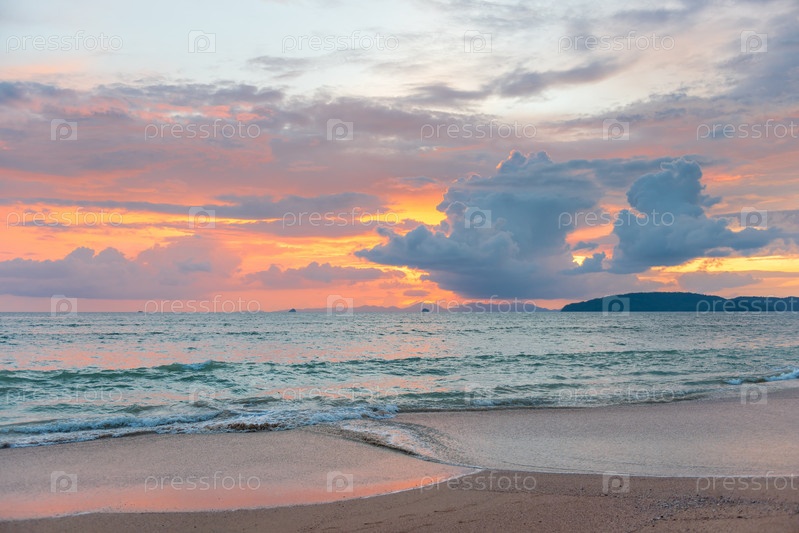 Розовый закат над морем, красивые кумулозные облака в небе