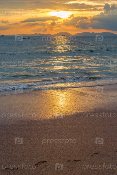 Песчаный пляж, спокойное море, кумулярные облака и красивый оранжевый закат над морем