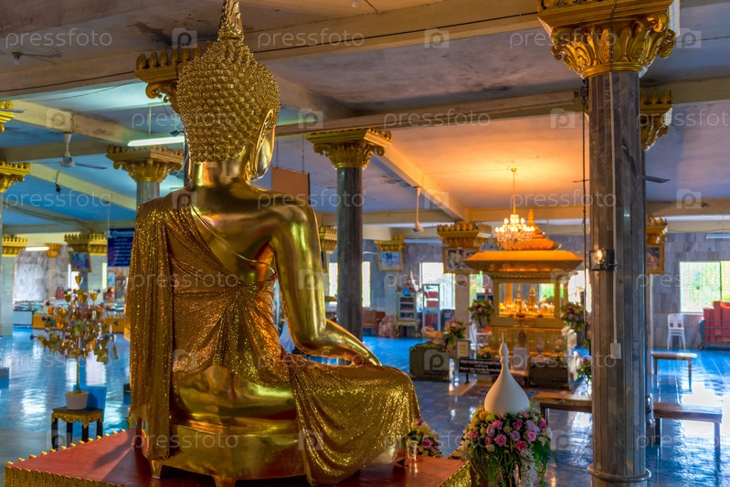Вид сзади скульптуры Будды в пустом храме в Таиланде