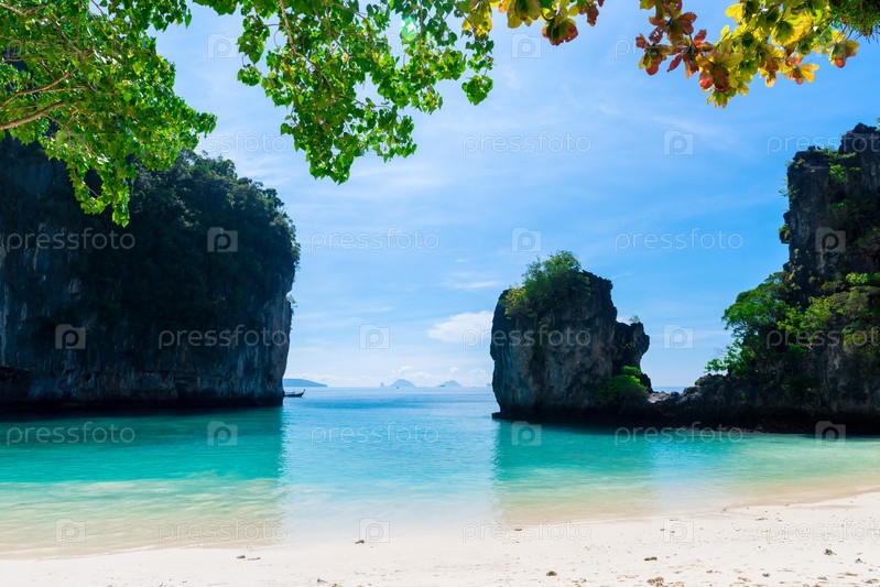 Пейзаж - вид на залив с острова Хонг с белым песком на пляже, Таиланд