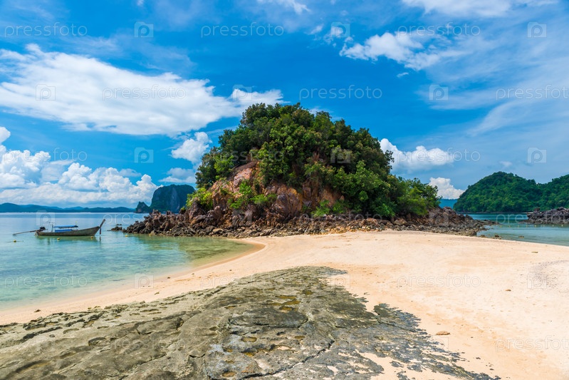 Пейзаж на острове с красивыми горами и скалами, лодка недалеко от пляжа острова