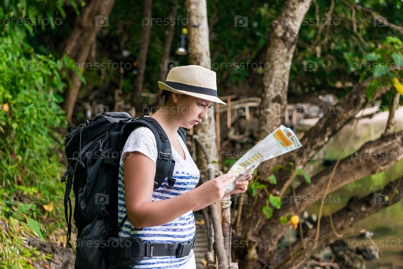 Женщина-туристка в шляпе с рюкзаком на походе по Азии