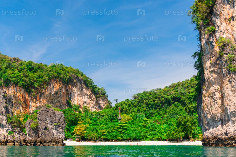 Зеленый остров с крутыми скалами, вид из моря на остров Хонг, Таиланд