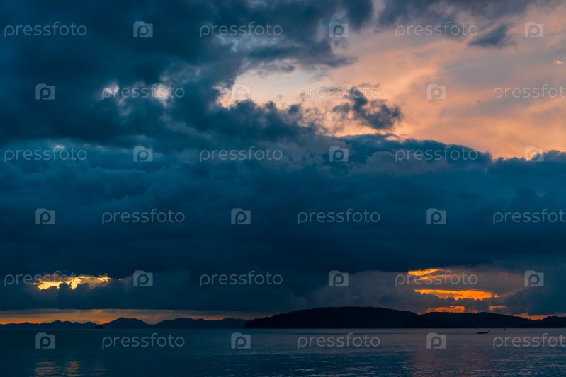 Темный пейзаж с голубыми облаками над морем после захода солнца, курорт Таиланда