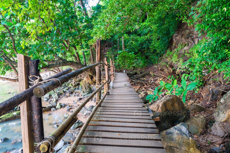 Пустая деревянная тропа в джунглях Таиланда недалеко от моря