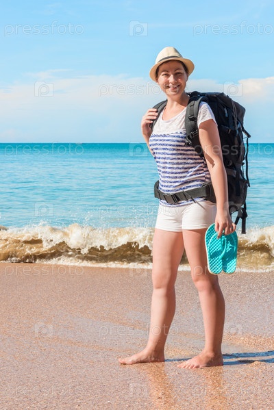 Вертикальный портрет туриста с рюкзаком на берегу красивого моря