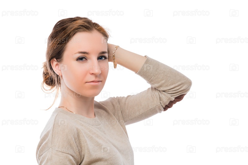 Красивая девушка на белом фоне в студии позирует, портрет изолирован