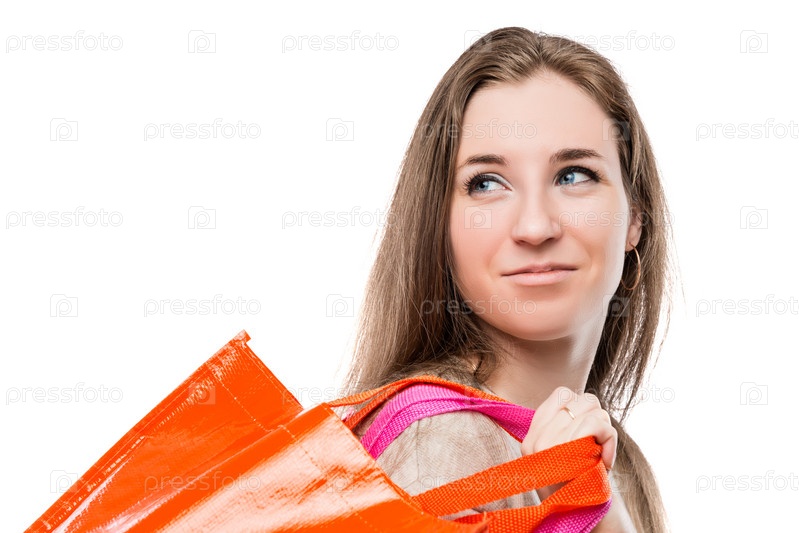 Близкий портрет девушки с сумками для покупок на белом фоне