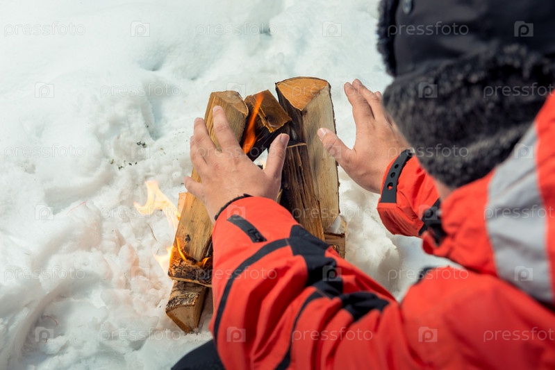 Ближайшее фото - турист согревает руки возле костра в зимнем лесу
