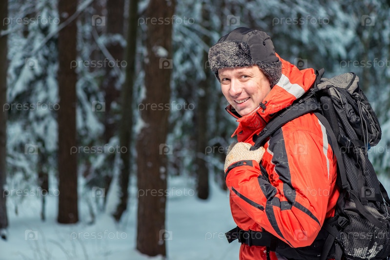 Счастливый турист в куртке на походе с рюкзаком в зимнем лесу