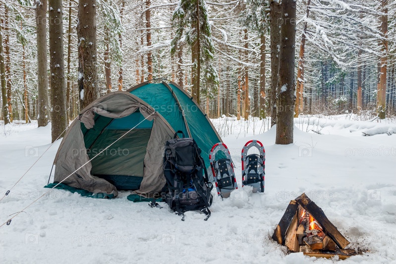 Закрытая палатка на снегу в зимнем лесу и огонь, без людей