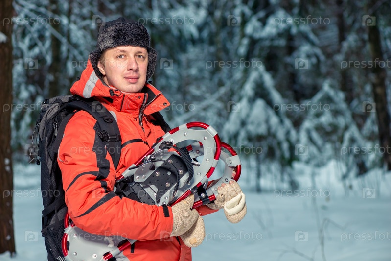Горизонтальный портрет туриста-мужчины со снегоуборочными тапочками в зимнем лесу