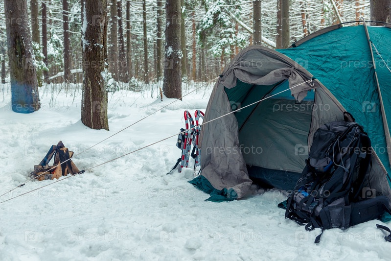 Походные палатки рано утром в зимнем лесу, люди внутри спят