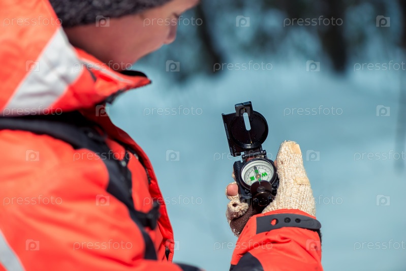 Турист проверяет маршрут с помощью компаса в зимнем лесу