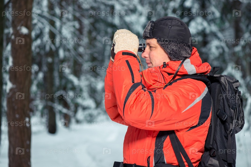Одинокий потерянный турист в зимнем лесу с биноклем