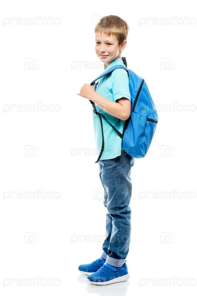 Портрет школьника с боковым видом рюкзака на белом фоне в полной длине