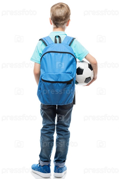 Школьник с рюкзаком и видом футбольного мяча из-за спины на белом фоне