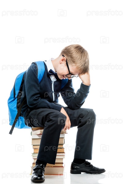 Мальчик в мыслях сидит на куче книг на белом фоне