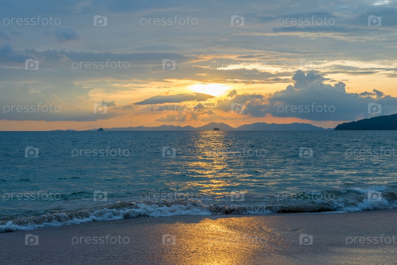 Чистое красивое море в лучах заходящего солнца с горами на горизонте, прекрасные пейзажи