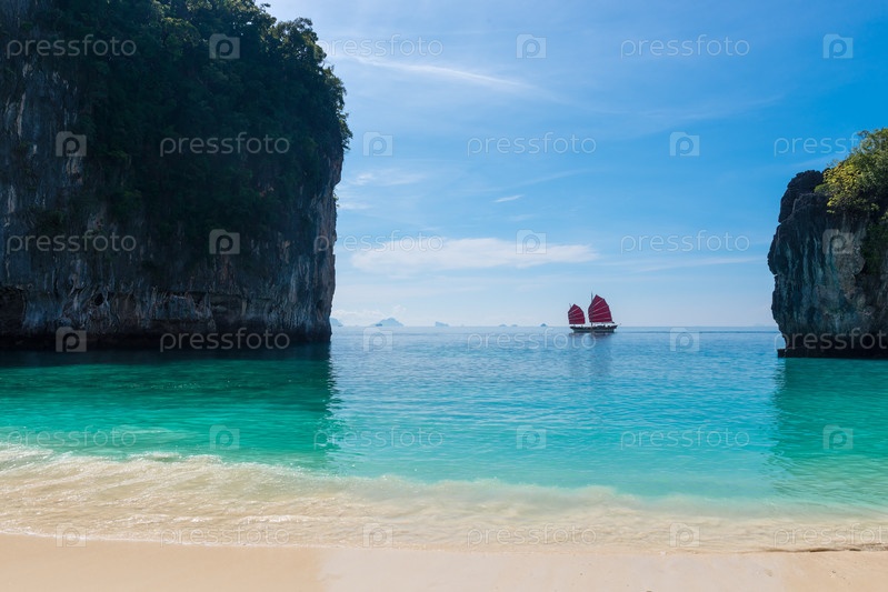 Красивый залив в Андаманском море, вид яхты с парусами с острова Хонг, Таиланд