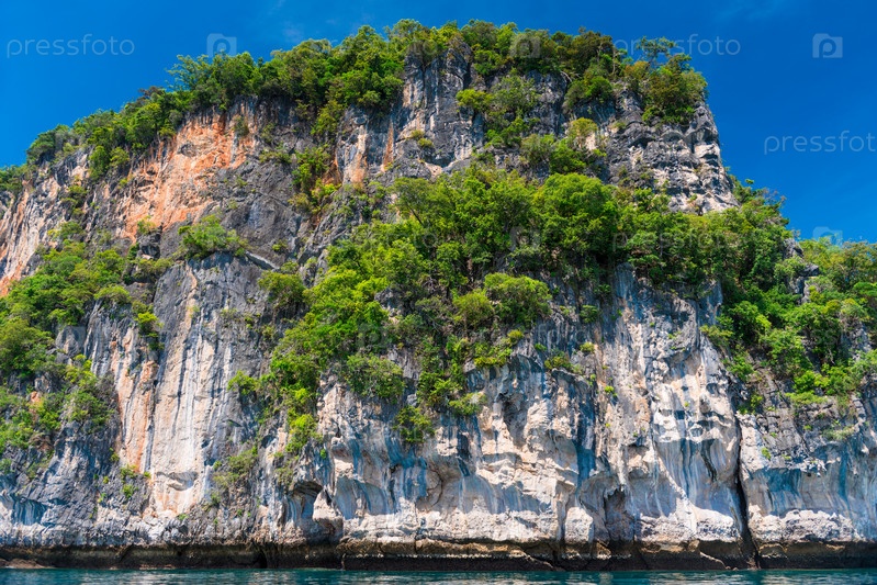 Высокая скала на пляже Таиланда. прекрасный вид с моря