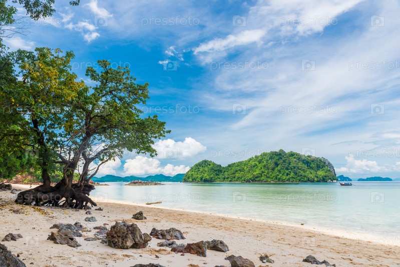 В рамке дерева, пляж, Андаманское море и красивые горы на горизонте, Тайланд, курорт Краби