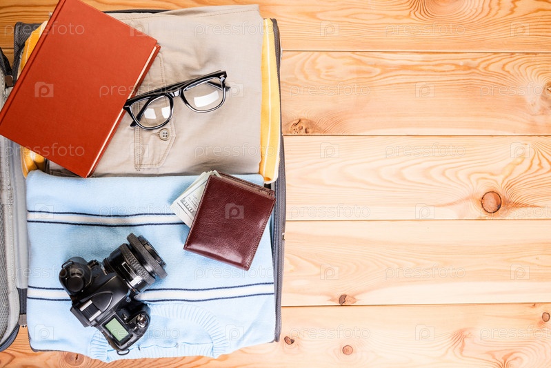 Мужской чемодан с одеждой и аксессуарами на деревянных досках, место справа
