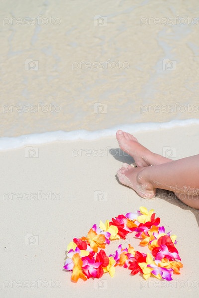 Флоральный гавайский лей в форме сердца возле женских ног на пляже, вид сверху