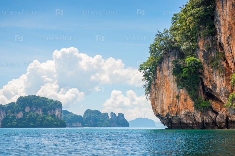 Вид на крутую скалу в Таиланде, ближайший план моря и гор