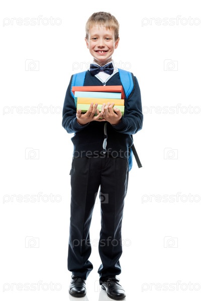 Улыбающийся школьник позирует на белом фоне, портрет изолирован по полной длине