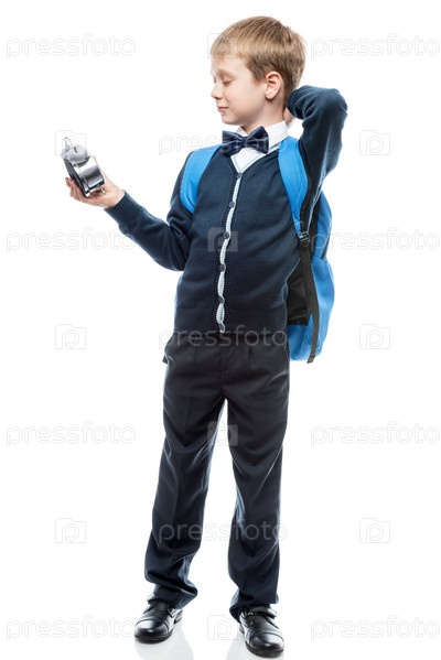 Проснувшийся школьник смотрит время на будильнике, портрет изолирован