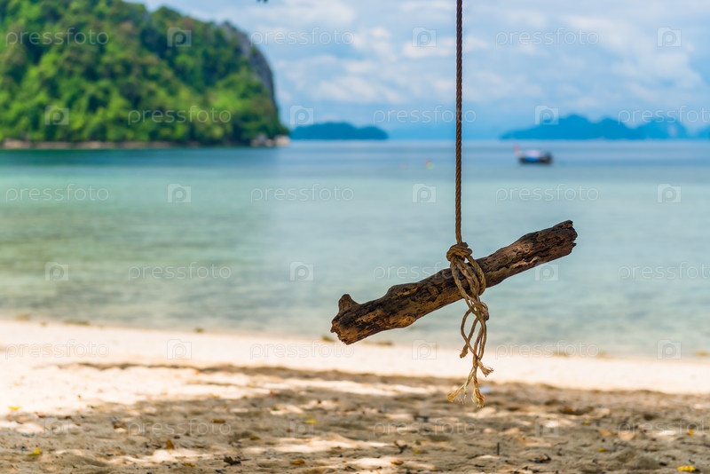 Деревянный качели на веревке в тени дерева в райском тропическом месте на острове