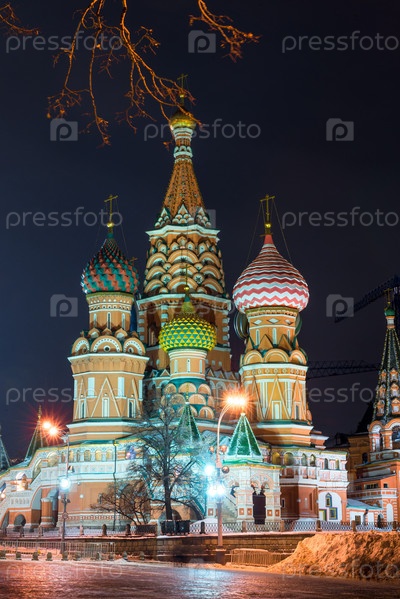 Вертикальный вид собора Святого Василия на Красной площади в центре города зимой ночью
