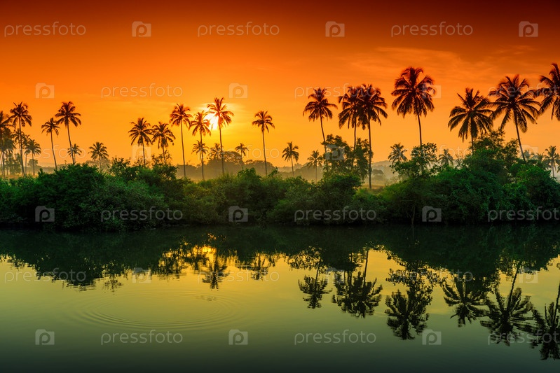Ряды пальмовых деревьев, отражающиеся в озере на рассвете