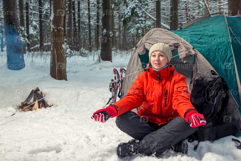 Молодой активный турист на кампании сидит возле палатки в зимнем лесу