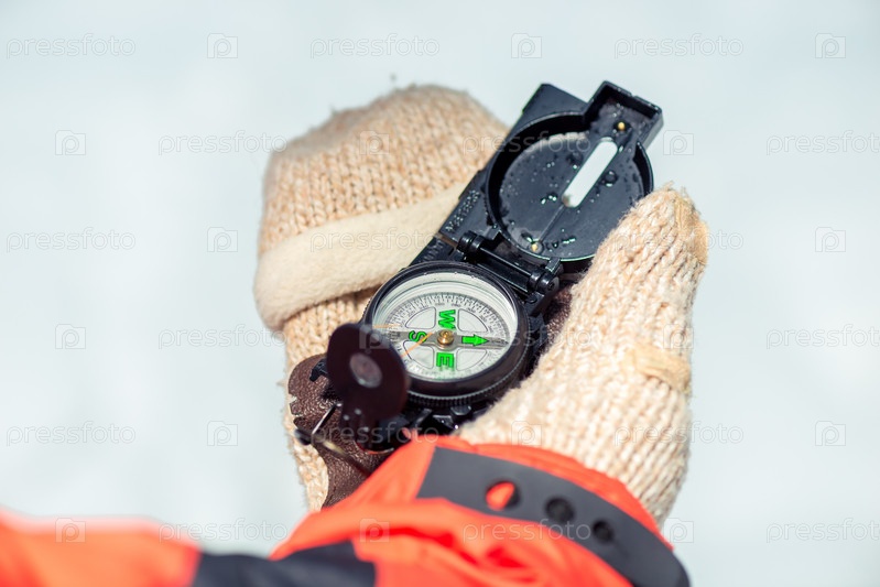 Компас в руке туриста, одетого в перчатки в зимний день