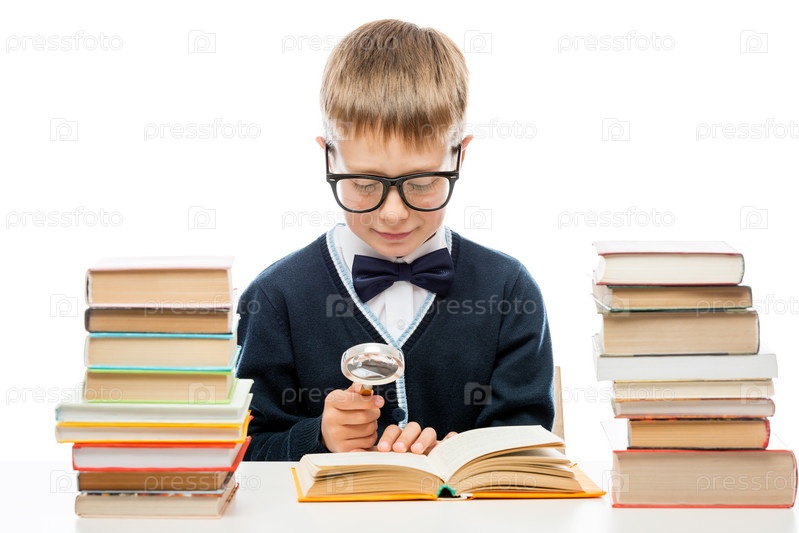 Умный мальчик в очках с лупой рассматривает текст книги, портрет изолирован