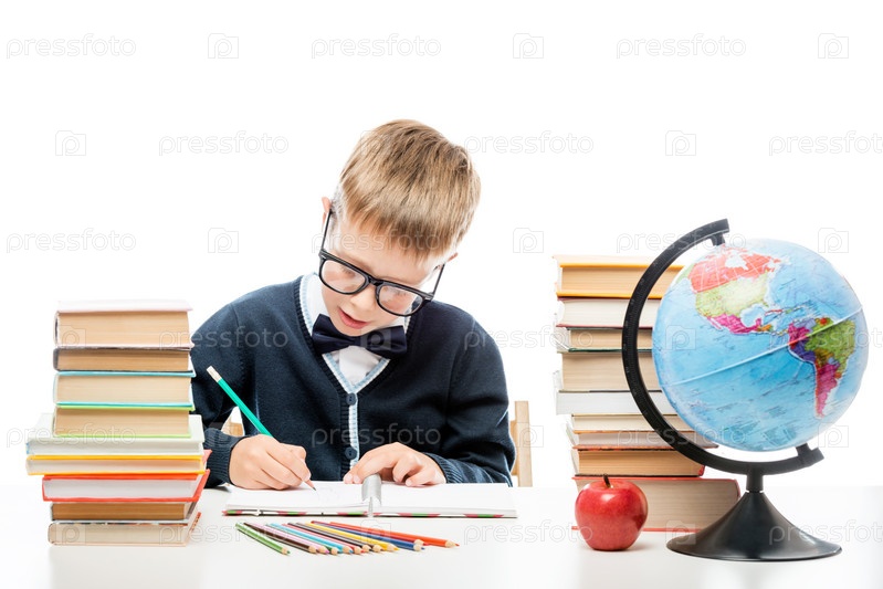 Школьный карандаш делает заметки в блокноте, рядом с кучей книг