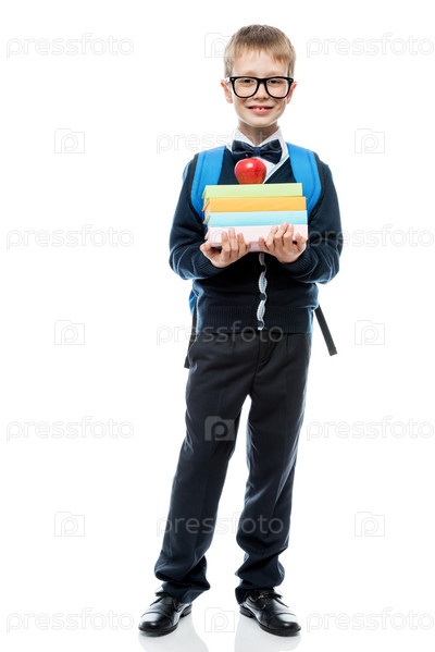 Умный школьник с кучей книг и красным яблоком в полную длину на белом фоне в студии