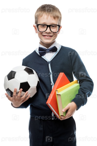 Счастливый умный школьник с учебником по футбольному мячу на белом фоне изолирован