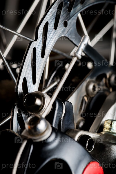 Стальной блестящий велосипедный тормозной диск вблизи на темном фоне