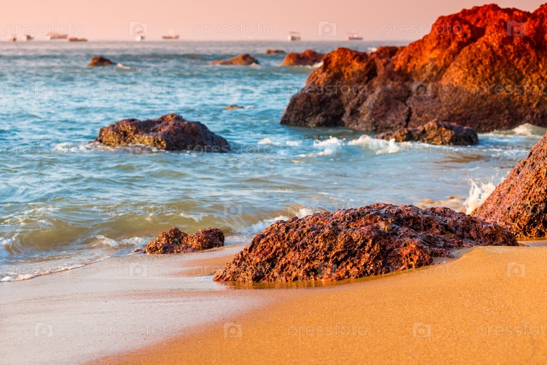 Красивые большие камни лежат на берегу океана, окрашенные в красный цвет
