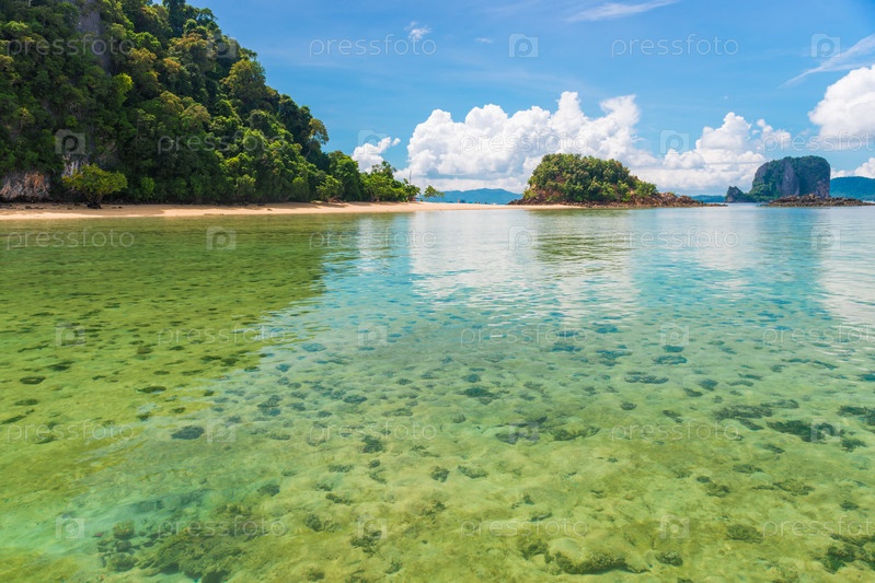 Вид на острова с мелководья, Андаманское море, Краби-Ресорт в Таиланде