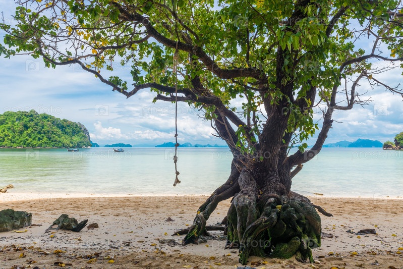 Большое ветвистое дерево на берегу в тропиках против моря