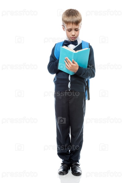 Школьник с учебником и рюкзаком на белом фоне в полной длине изолирован