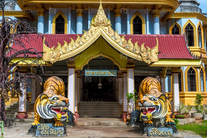 Две скульптуры тигров у входа в традиционный тайский храм в Краби